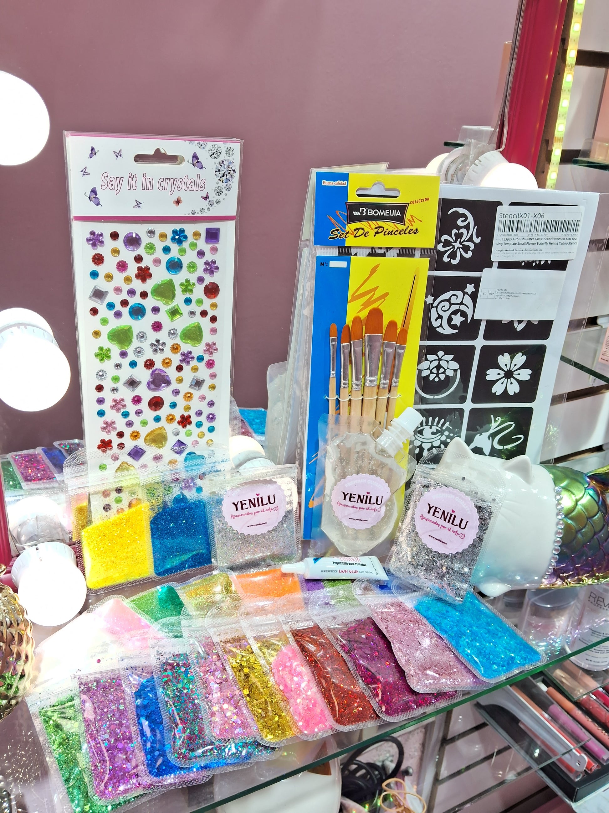 Gliiter Bar Completo ,este súper pack te permitirá tener una variedad de acabados en glitters para realizar las últimas tendencias del glitter bar y caritas pintadas , así llevar a tus clientes o invitados a la mejor de las experiencias.