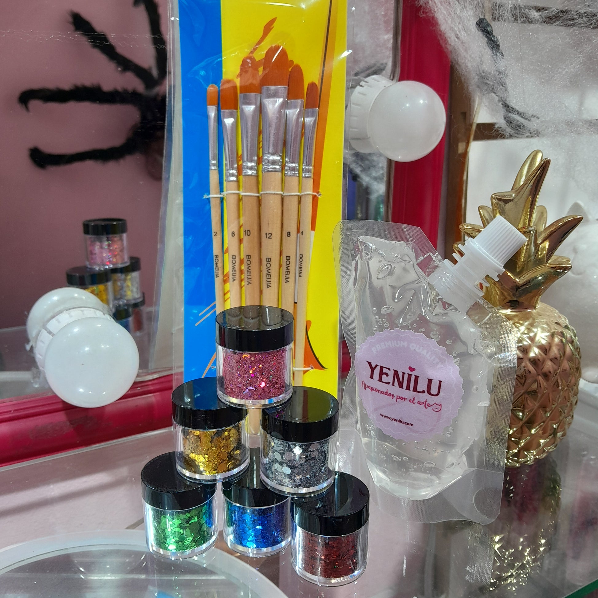 Este súper pack te permitirá tener una variedad de acabados en glitters para realizar las últimas tendencias del glitter bar y caritas pintadas , así llevar a tus clientes o invitados a la mejor de las experiencias.