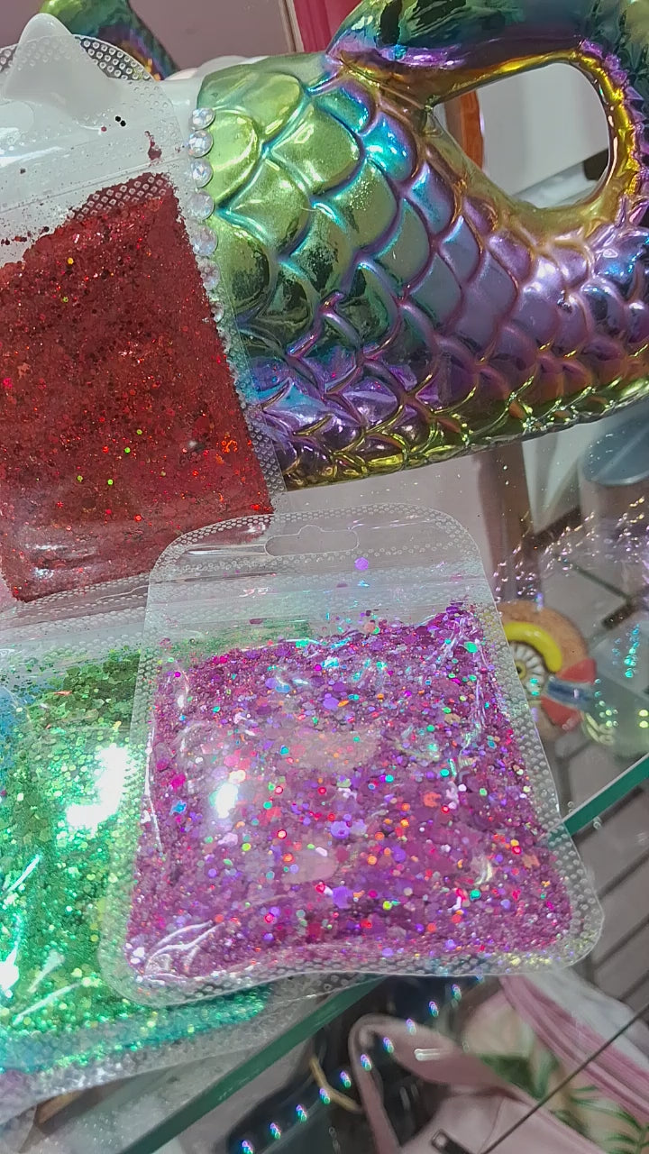 Glitter Efecto Sirena de Yenilu, esta vez te traemos esta opción en formatos mas pequeños de nuestros sachets y llévate los 12 colores. (3gr c/u)